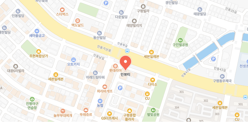구미 구평동 다이소 근처에 위치해 있어 찾아가기 매우 편리합니다. 정확한 주소는 방문 전 네이버 지도에서 '구미 인뷰티'를 검색하시면 자세히 알 수 있습니다. 주차는 길가에 하시면 되고요~ 자리가 없는 경우 롯데ㅇ아 앞에 주차공간이 있으니 참고해 주시기 바랍니다.