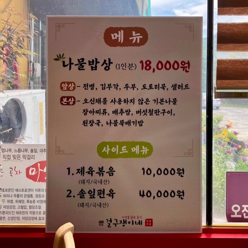 여주 걸구쟁이네는 사찰음식 전문점입니다. 30년 전부터 식당을 하셨었고 그때부터 함께한 소금이 맞이하는 걸구쟁이의 메뉴로는 사찰정식, 나물밥상, 제육볶음, 솔잎편육등이 있습니다. 애피타이저로 나물 샐러드, 전, 도토리묵, 두부가 나옵니다.