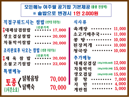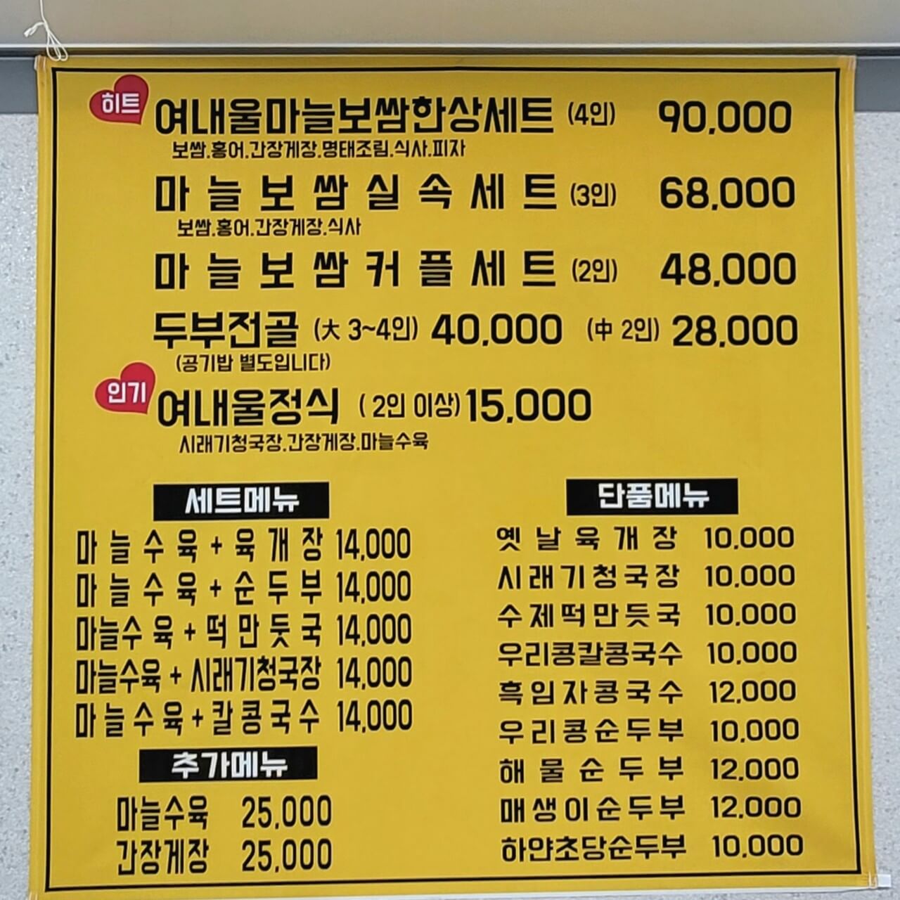 식객 허영만의 백반기행에 나왔었던 여주 한식맛집 여내울에 메뉴는 마늘보쌈, 여내울정식, 마늘수육, 육개장, 옛날육개장, 시래기청국장, 수제 떡만둣국, 우리 콩 순두부, 우리 콩 칼콩국수, 흑임자 콩국수, 간장게장 등이 있습니다.