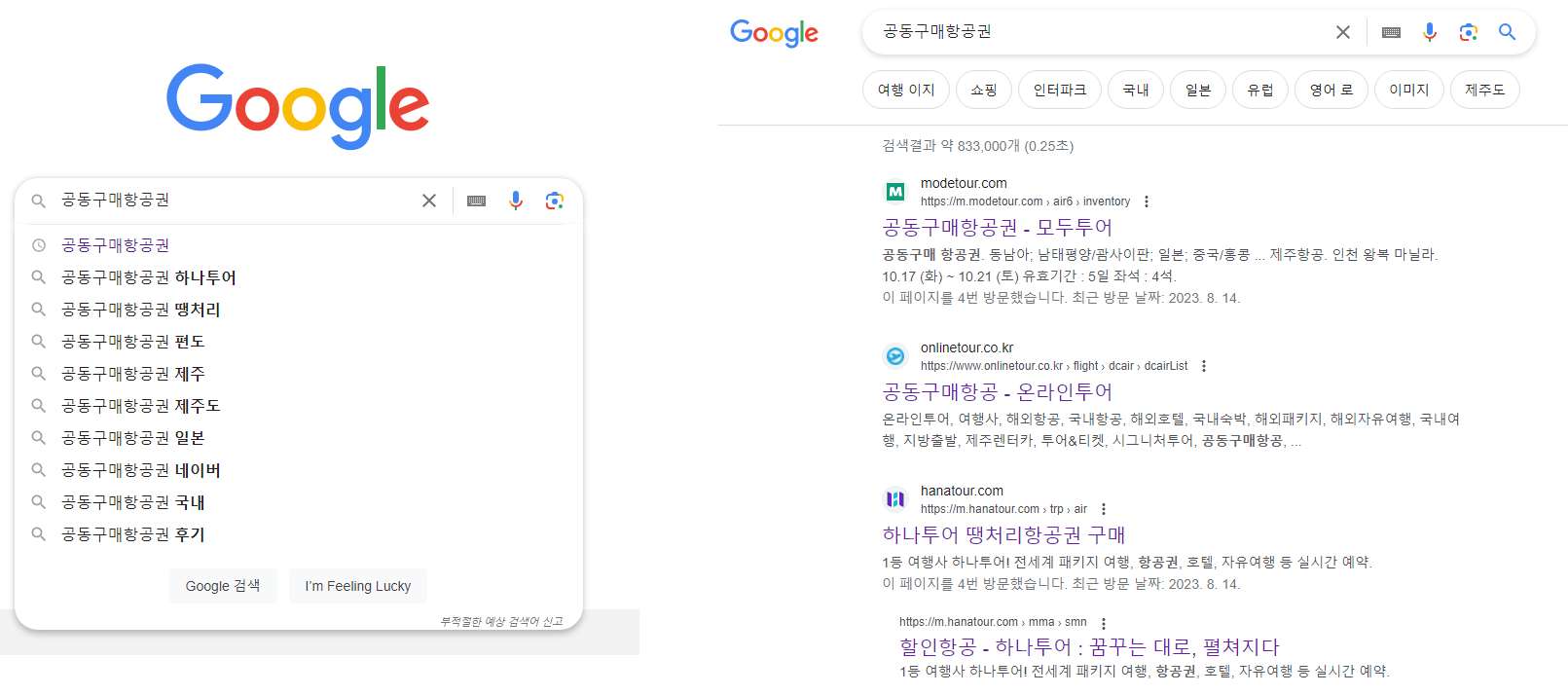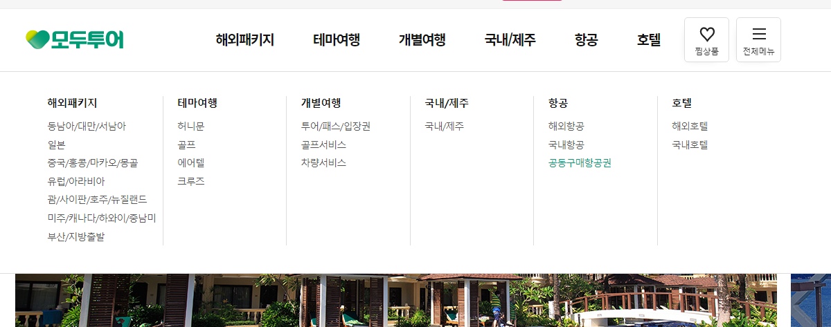 구글에 공동구매항공권으로 검색을 하면 최상단에 있는 사이트가 모두투어입니다. 홈페이지에 들어가면 따로 공동구매항공권이라고 분류가 되어있습니다.