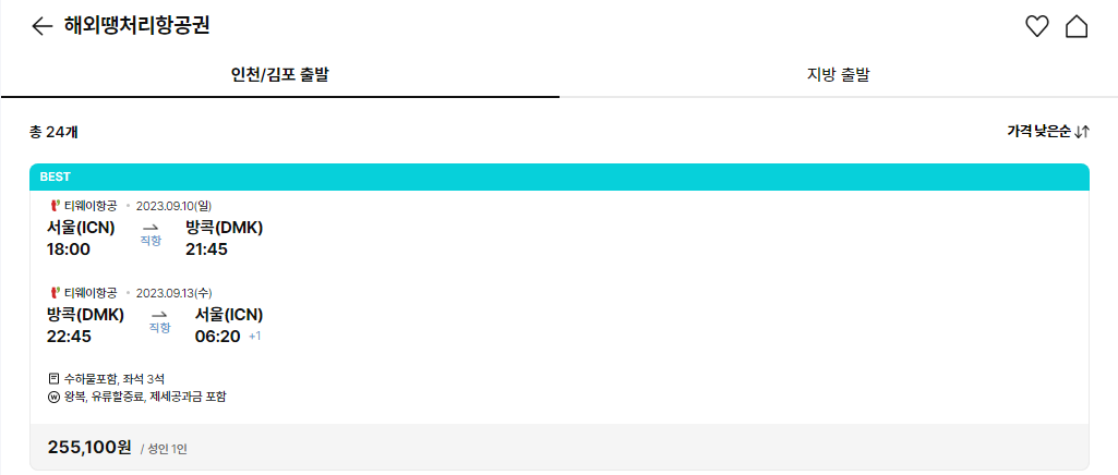 일단 하나투어에서는 인천에서 방콕까지 여행날짜가 9월 10일부터 9월 13일이고, 총금액이 255,100원 입니다. 그렇다면 티웨이항공편에서는 가격이 어떻게 될까요?