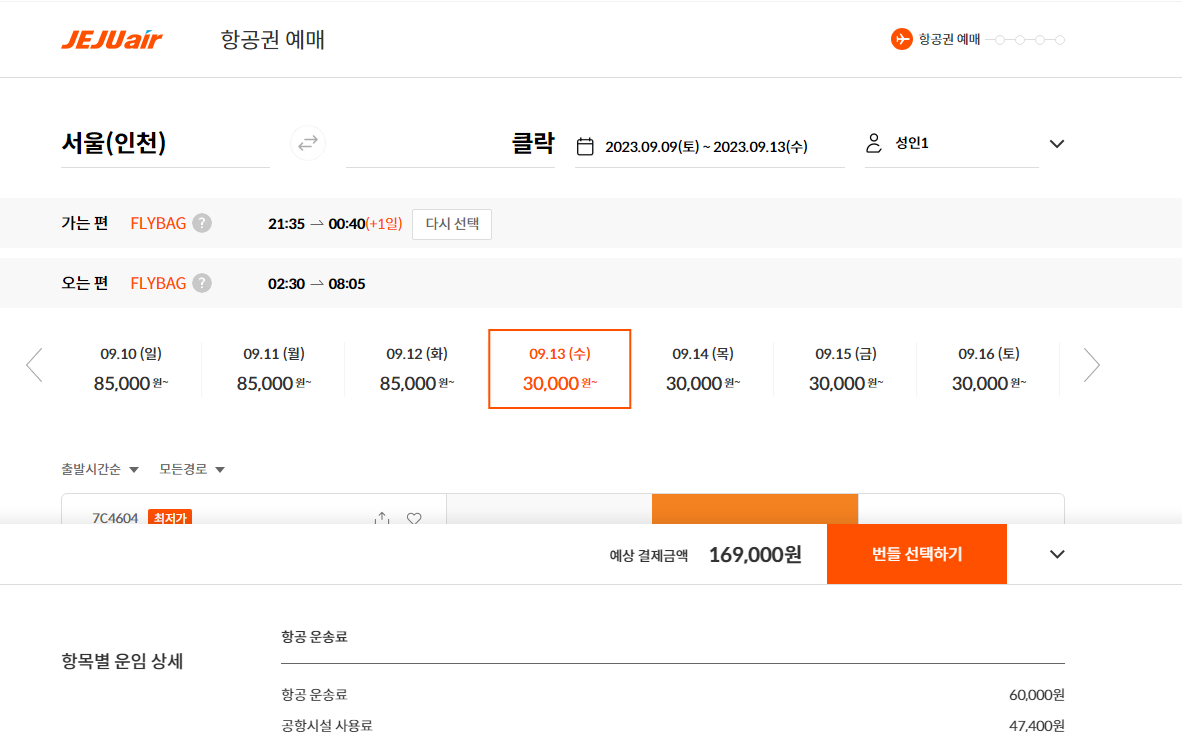 왕복날짜와 시간을 동일하게 하여 검색을 해본 결과 제주항공에서는 총 항공운임료가 169.000원입니다. 좌석이나 다른 조건들을 선택할 때 제일 저렴한 걸로 모두 선택을 하였는데도 모두투어와 1만 3천 원이 차이가 나네요.