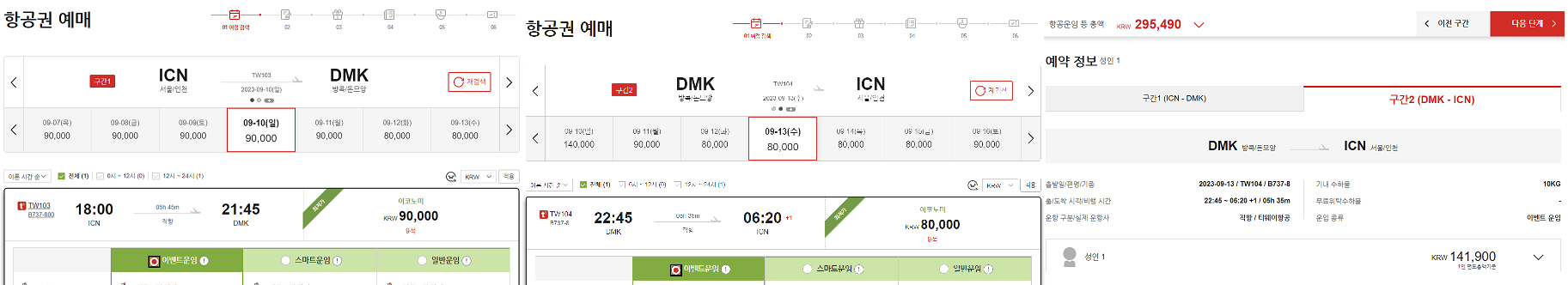 티웨이항공은 여행날짜에 총 금액이 295,490원이 나오네요. 이번에는 총 40,390원이 더 차이가 나는 걸 알 수 있습니다.