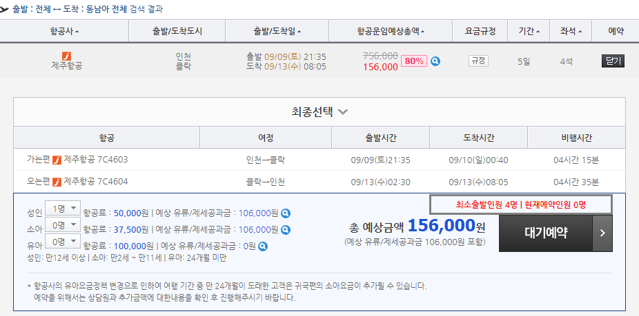 일단 저는 아무 곳이나 비교를 해보기 위해서 인천에서 클락으로 가는 비행기 편을 검색을 해 봤는데 할인률이 80%라고 합니다. 가는 편은 인천에서 9월 9일 출발, 오는 편은 클락에서 9월 13일 출발이고, 총 예상금액은 156.000원입니다. 그렇다면 제주항공에서는 가격이 어떻게 될까요?